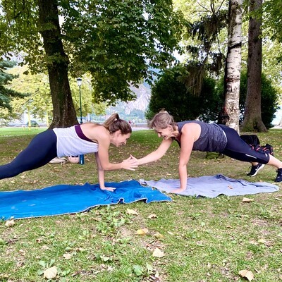 En extérieur - rendez-vous dans un très beau jardin public au bord du lac, à 5 minutes à pied de l'hôtel.